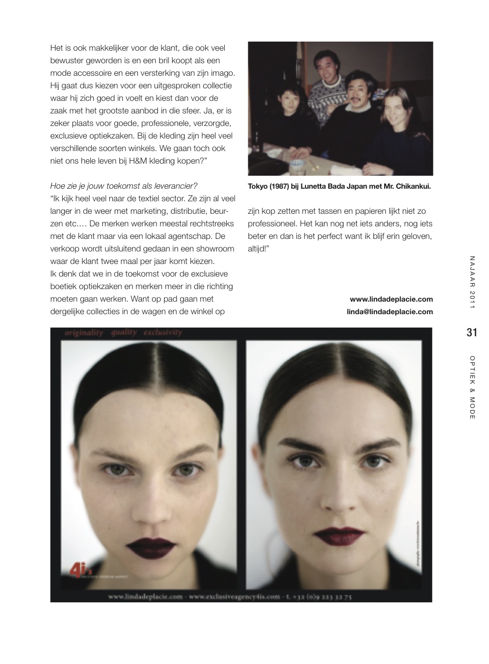 Since 2004 she has been profiling herself with her current company 4 I’s (for eyes) Exclusive Eyewear Agency, especially in the Benelux market as THE agency for several exclusive well known international eyewear brands from Los Angeles: Oliver Peoples , Chrome Hearts eyewear and Jacques Marie Mage , from Japan Matsuda and Yohji Yamamoto and from German : Lunor