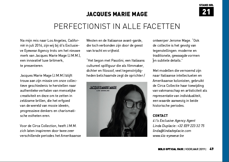 Jacques Marie Mage Maker of rare, collectible spectacles that combine historical motifs with precious materials, innovative production methods, and ethical business practices.  Jacques Marie Mage (JMM) is a Los Angeles-based producer of limited-edition designer goods that specialize in the micro-production of artisanal eyewear.  Drawing inspiration from across continents, cultures, and generations, JMM combines world-class craftsmanship with advanced production methods, embracing an array of rich materials, bold geometric shapes, and an exuberance of attitude to create impeccably crafted spectacles that elegantly infuse historical motifs with a modern sensibility.  Powerful, playful and meaningfully idiosyncratic, JMM offers sophisticated statement pieces infused with a distinct perspective, eyewear informed by a design language that combines a respect for history, craft, and technical innovation, ultimately resulting in small-batch goods that pay homage to the past while pushing the aesthetic into the future.