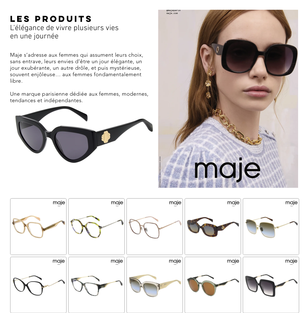 Avec une touche de raffinement ludique et des designs distinctifs, les lunettes MAJE apportent un regard frais sur votre style personnel. Chaque monture est imprégnée du savoir-faire français, vous offrant une allure unique qui renforce votre confiance en vous. Des chic yeux de chat aux montures oversize discrètes, MAJE propose quelque chose pour tous les goûts. Alors, embrassez votre charme unique, enveloppez-vous de style et voyez le monde clairement et avec élégance grâce à MAJE d'ADCL !